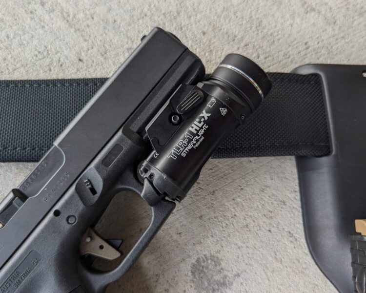 The Glock 17 with the Streamlight TLR-1 HL-X shining in indoor hallway