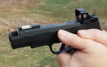 If you don’t like optics, then the front sight is a black ramp that’s pinned instead of being a solid part of the barrel. A pinned sight is a sight that can be changed, and that’s an option.